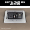• 110V power pop-up outlet includes two USB ports for charging devices