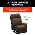 - Power adjustable lumbar and headrest, reclining, heating, and massage capabilities