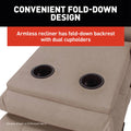 - Fold-down armless recliner design features dual cup-holders